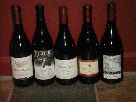 Mac Murray Range Under $20.00 Retails at $17.00 3 Wine Guys Rating Grade: B Aroma: Earthy, Soil, Spice Taste: Cherry-Pie Body: Medium Finish: Long Finish...slight licorice Recommendation: Buy it. Elizabeth Spencer $20.00 to $40.00 Retails at $25.00 to $30 3 Wine Guys Rating Grade: C+ Aroma: Black berry, Clay?, Earthy Taste: Cherry Kirsch, Spice, Slight Heat Body: Delicate but some Tannins are present Finish: Oaky Recommendation: Pass on it. Wild Hog Vineyard $20.00 to $40.00 Retails at $25.00 to $30.00 3 Wine Guys Rating Grade: B+ Aroma: Earthy, Clove, Spice Taste: Kirsch, Slight Tannin Dance Body: Big Finish: Spice, Big Recommendation: Buy it. (Wine of the Night)